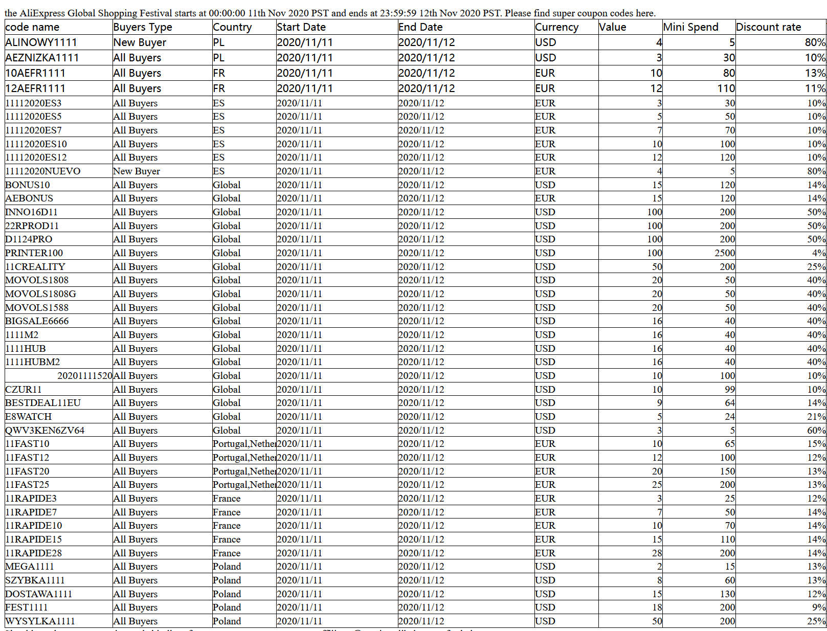 Upd: Прошу прощения, выяснилось, что там многие промокоды - для конкретных позиций, поэтому для других позиций могут не срабатывать. Я перенес все данные в электронную таблицу, там в конце строки промокода - адрес, к которому он относится.