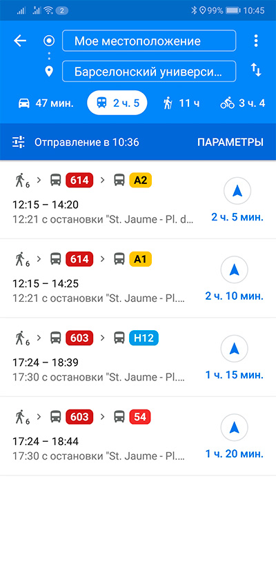 Но для маршрутов общественным транспортом намного лучше использовать Citymapper: у них и сайт есть, и приложения под разные платформы. Citymapper все показывает, как полагается. А Гуглу - позор и незачет!