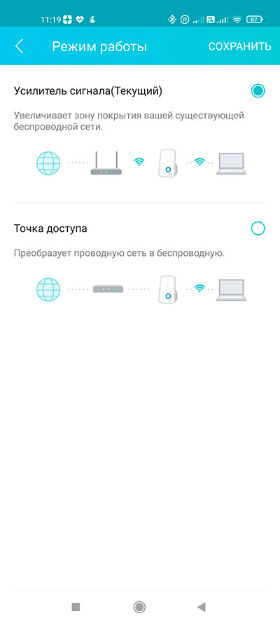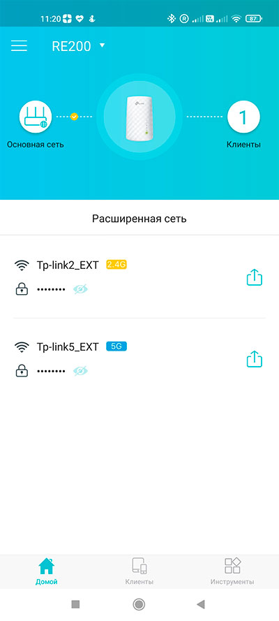 Его можно настраивать через админку в браузере компьютера, но намного удобнее - прямо в смартфоне через приложение TP-Link Tether. И там все просто. После включения адаптер создает две открытых сети Wi-Fi - на 2,4 ГГц и на 5 ГГц. Подключаетесь к любой из них, в приложении обнаруживаете репитер, выбираете режим работы (он может работать точкой доступа, если подключается к проводной сети, или усилителем существующей сети Wi-Fi), указываете, какую сеть нужно усиливать, вводите пароль от этой сети, даете названия и задаете пароли для сетей на 2,4 и на 5 ГГц, создаваемых репитером.