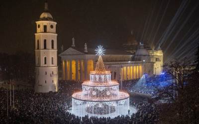 Дерево-торт украшают 700 свечек. В 2023 году Вильнюс отмечает 700-летие, этим и обусловлен выбор дизайна.