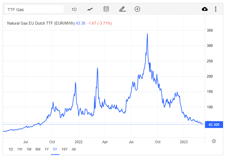 Газ эквивалентный энергетически мегаватту сейчас стоит 70 евро. В августе он стоил 350 евро. Это большое снижение, но раньше цена за газ была между 10 и 20 евро. Для энергоемких компаний это является бюджетным кошмаром.