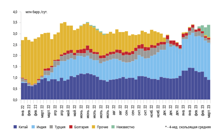 Внизу, например, график, как менялись получатели экспорта российской нефти в 2022-2023 гг., где чётко видно, что в начале 2022-го львиная доля шла в "прочие" страны (прежде всего в Европу), а в начале 2023-го "прочие" практически исчезли, а почти вся нефть пошла в Индию и Китай.