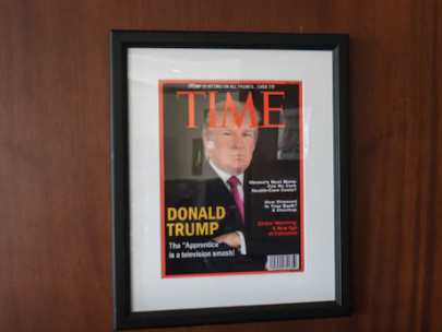 In fact, the cover on display at Trump's clubs, observed recently by a reporter visiting one of the properties, contains several small but telling mistakes. Its red border is skinnier than that of a genuine Time cover, and, unlike the real thing, there is no thin white border next to the red. The Trump cover's secondary headlines are stacked on the right side — on a real Time cover, they would go across the top.