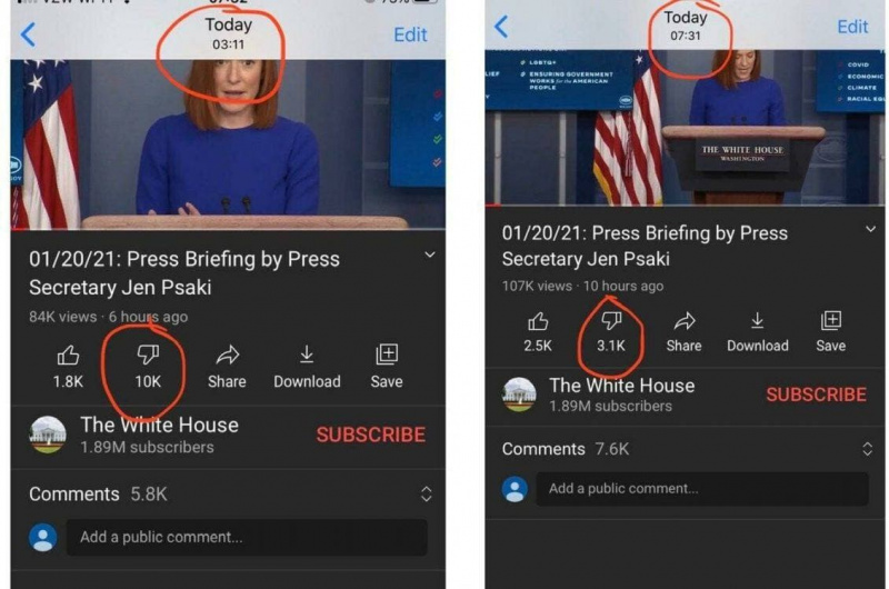 Внимательные люди заметили, что у первого ролика с пресс-брифингом новой администрации США в течение четырех часов куда-то испарились примерно 10 тысяч дизлайков (3,1К - это то, что вновь появилось за это время). (Отсюда.)