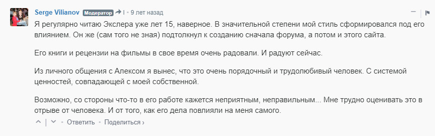 Вышеизложенное - это личное впечатление, которое сложилось по прочитанным на сайте Вильянова статьям за многие годы. Давно его начал почитывать.