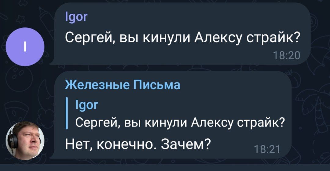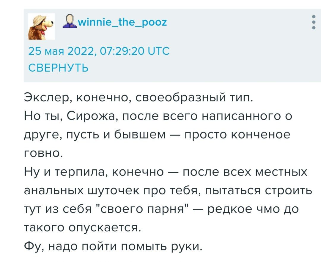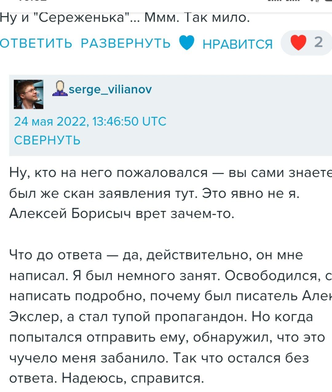 Что он мне, кстати, хотя и косвенно, но подтвердил, чтобы мне не говорили, что я на него, может, и зря наговариваю. Когда до меня вся эта информация дошла, я его напрямую спросил в мессенджере - он это или же его ЖЖ поломали ушлепки, и теперь от его имени постят всякую погань. Сереженька сообщение прочитал (оно же видно), но в лицо ответить, что это он, не смог - зассал. Ну, дело такое, я понимаю.