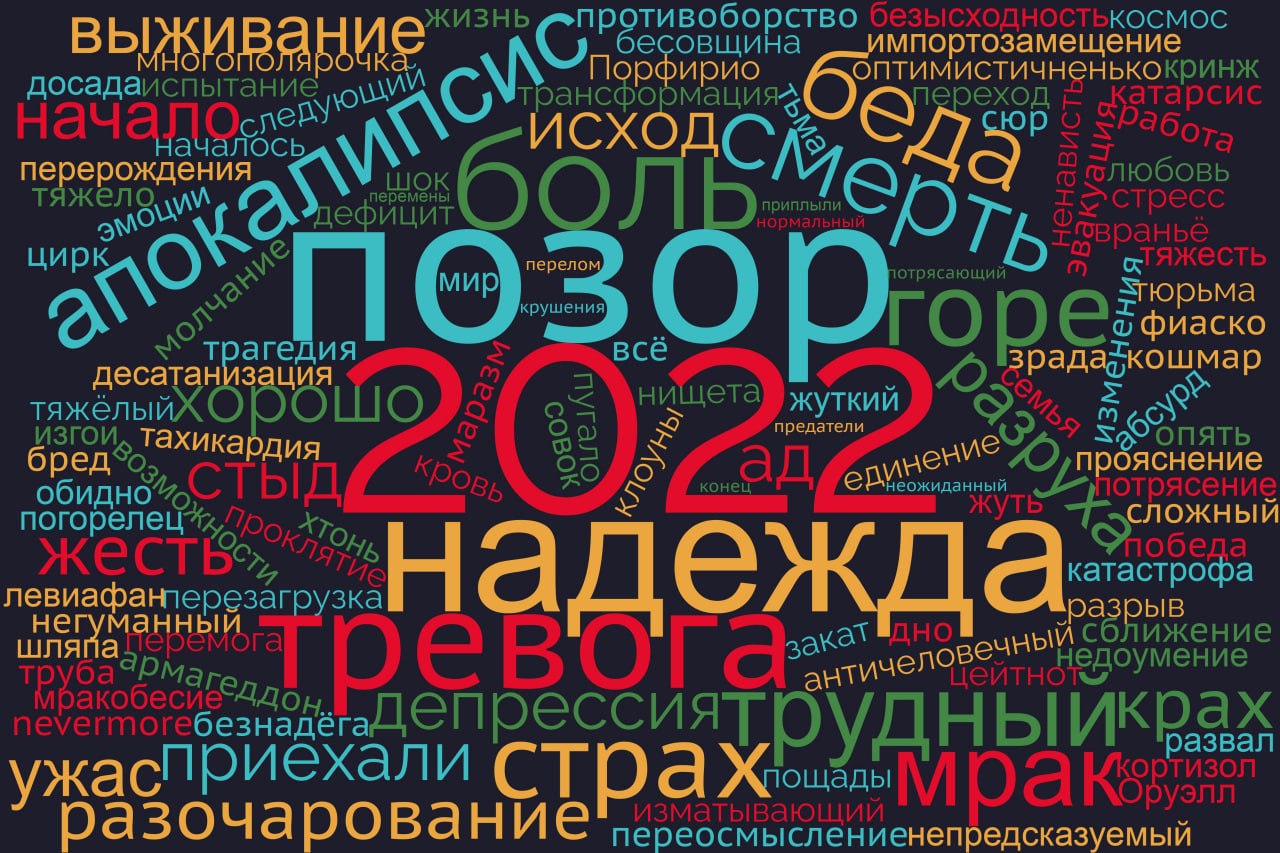 Мы попросили наших читателей (то есть вас) в разных социальных сетях охарактеризовать одним словом уходящий год. Затем мы собрали ваши комментарии и пропустили через генератор облака тегов. Наиболее часто упоминаемые слова большего размера, реже упоминаемые — меньшего. Не все слова мы смогли взять из-за законодательства РФ. Одно слово (упоминавшееся чаще всего) мы заменили на 2022. Итак, прошедший год вашими глазами.