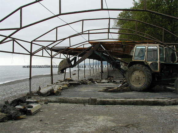 Подчеркиваю - у нас был официальный договор аренды. Оплаченный на весь сезон. (По-моему, мы в Лазаревке единственные официально это делали.) И у нас снесли за час кафе только потому, что какому-то херу из Сочи оно загораживало вид. А нас забрали в милицию - за сопротивление властям. И собирались еще посадить на 15 суток.