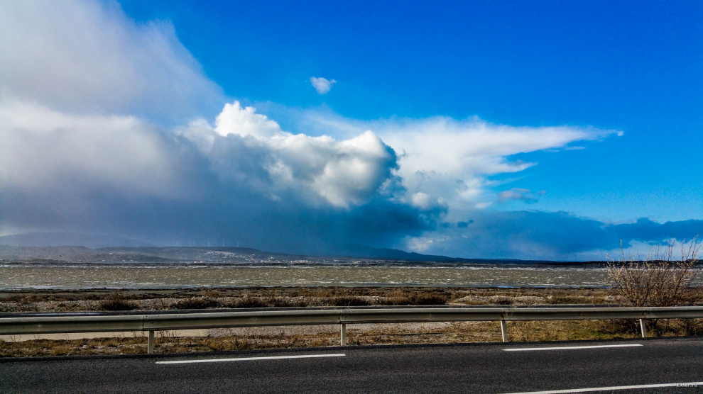 Вот этот залив, который на фото, обычно прозрачно-зеленый. В такую погоду он стал темно-коричневым. Мы остановились, чтобы сфотографировать, вышли из машины - и нас ветром впечатало в машину: задувало не по-детски.