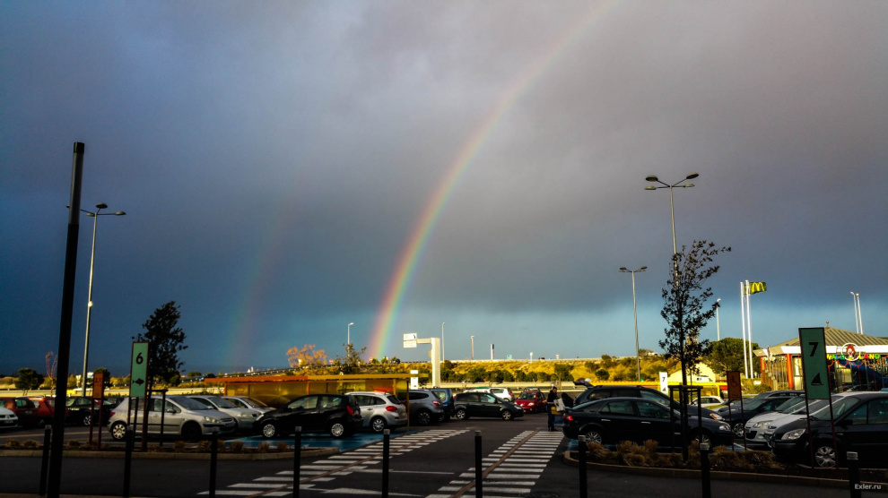Погода во Франции была очень своеобразная: дул дикий ветер (заметно за 20 метров в секунду), по небу все время шли какие-то суровые тучи, моросил мелкий дождик, всю дорогу то там то там вылезала радуга.