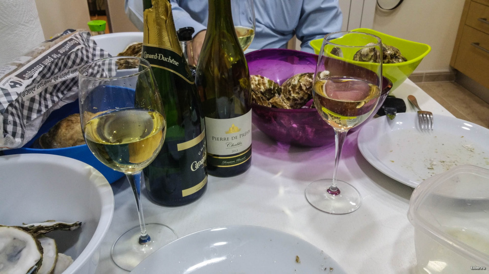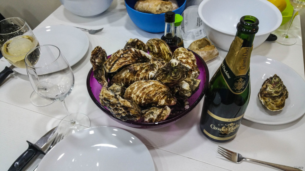 Мы быстро рванули домой - и через каких-то полтора часа могли отрапортовать, что к приему пищи - готовы! Руденко, кстати, показал новый способ открывать устрицу: не со стороны устья, как обычно советуют, а сбоку, напротив мышцы. Протискиваешь туда нож, перерезаешь мышцу, открываешь. Удобно и быстро - мы эти устрицы вскрывали за три секунды.
