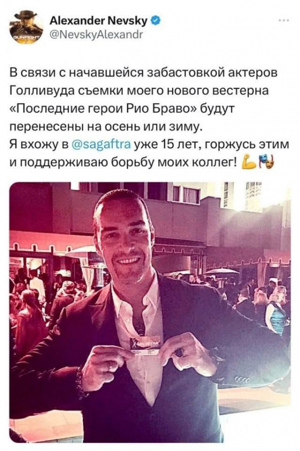 В связи с начавшейся забастовкой актеров Голливуда съемки моего нового вестерна «Последние герои Рио Браво» будут перенесены на осень или зиму. Я вхожу в SAG-AFTRA уже 15 лет, горжусь этим и поддерживаю борьбу моих коллег!