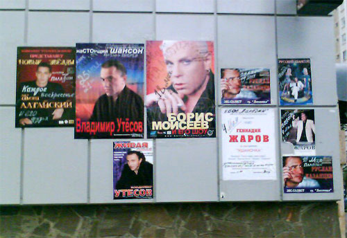 На стене здания, находящегося неподалеку, висят афиши местного клуба-казино. Там обычно собирается публика соответствующая, поэтому большой популярностью пользуется так называемый шансон, который на самом деле блатняк. Вот афиша.