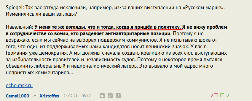 Ну а чуть ниже в комментах ссылка на запись Навального в его ЖЖ, где он сожалеет о высказываниях. Дальше что? "Взгляды" и "высказывания" - не одно и то же.