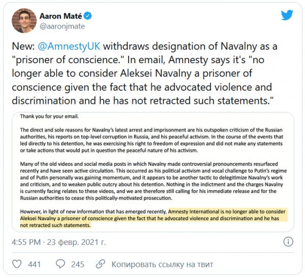 Купленные "Рашей тудей" зарубежные блогеры настучали на Навального в... Amnesty International, которая до этого признала Навального узником совести и потребовала от России его немедленно освободить.
