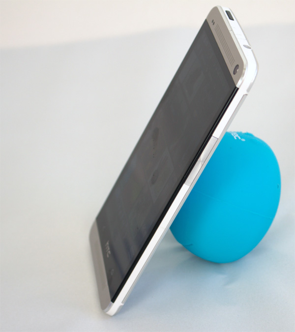 На нижней части колонки - присоска. Колонка крепится к телефону-планшету и может служить подставкой.