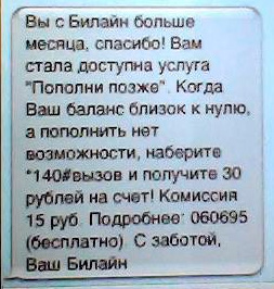 У меня домашний интернет-провайдер тоже ввел услугу - если счет пустой, а должна быть оплата, можно авансом положить 300 рублей на счет, которые вы потом должны погасить в течение трех дней. (Чтобы доступ в Интернет все время был и не прерывался.) Причем они за это ни рубля не берут. Почему? Потому что идиоты. Нет в них такой заботы о клиенте, как у Билайна. Браво, Билайн, бра-во!