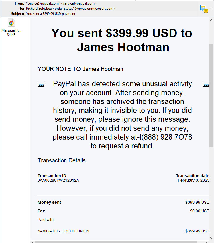 Как раз сегодня мне пришло схожее письмо. Я не Джеймс Хутман и адрес получателя не мой, но судя по заголовкам письма (оно отправлено с outlook) мой адрес был в СС. Тоже телефон, тоже О вместо нуля. Но! Внизу есть линк Get the Details. И ведет он на вполне настоящий адрес PayPal.