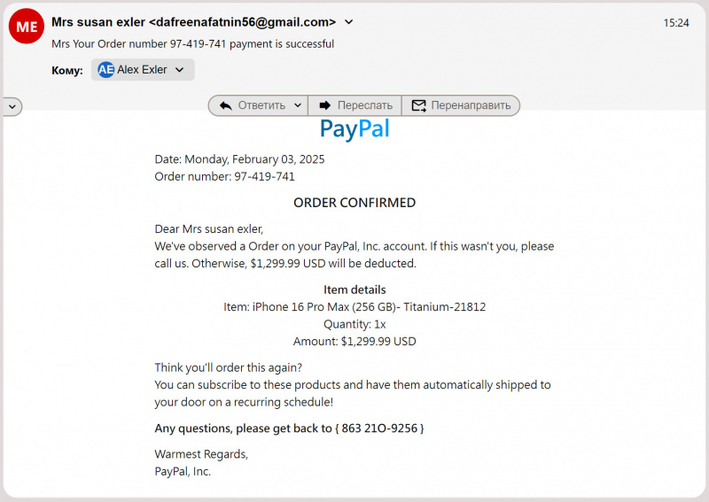 Мы заметили заказ на вашем счете PayPal, Inc. Если это не вы, пожалуйста, позвоните нам. В противном случае, $1,299.99 USD будут сняты.