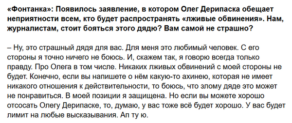 Ну, вообще, в выдержке из интервью троллит она вовсе не Дерипаску, а берущего интервью журналиста.