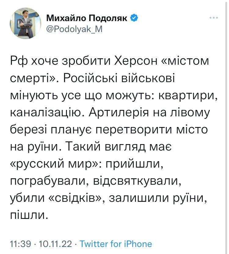 Про неизбежность отхода россиян с правобережья Херсонщины писали месяца два - ну невозможно снабжать необходимую группировку на понтонах. И последние неделю-две призывы к переговорам усилились многократно. Папа Римский, всякие разные политики, намеки, "аналитика" в СМИ, что раз Зеленский в обращении с готовностью к переговорам не упомянул, что не готов говорить с путиным, то значит уже согласен на переговоры именно с ним. Все считали, что это попытка нагнуть даже не Украину, а западных партнеров нагнуть Украину на переговоры к саммиту G20 за счет создания гуманитарной катастрофы и угрозы новой многомиллионной волны беженцев.