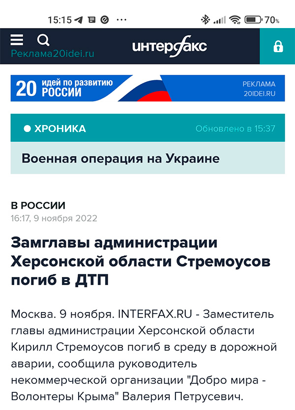 А иногда - нет. Особенно в день объявления отступления россиян с правобережной Херсонщины. Особенно с учетом времени создания видеофайла обращения Сальдо о гибели Стремоусова на два часа раньше первых сообщений в телграм-каналах. Что сообщил личный водитель. Что до позднего вечера скрывали фото "ДТП".
