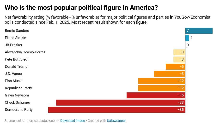 Кстати, заметили, насколько отношение к Сандерсу и AOC лучше, чем к демократической партии в целом? Ох, не любят сейчас центристов и умеренных, предпочитают во власти Чапаева с Петькой или барона Унгерна.