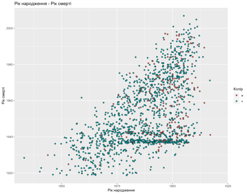 Вот тебе график. По осям год рождения и смерти украинских ученых. Ничего необычного не видишь?