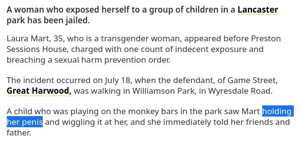 Эксгибиционист неоднократно доставлял неудобства, нарушал общественный порядок, вовлечены дети. За что и был наказан, достаточно серьезно, кстати. Никто не выступал в его защиту, не требовал для него никаких плюшек, более того, если бы вы удосужились прочитать оригинальную статью, вы бы узнали, что адвокат сказала что трансгендерность не является оправданием. Человек уже несколько раз представал перед судом, арестовывался и ему до этого уже был выписан пожизненный запрет на приближение к детям и был «lifelong sexual harm prevention order”. Это человек с девиациями, неоднократно привлекавшийся к ответственности. Сейчас он арестован и осужден. (Специально, что бы не растревожить вашу тонкую натуру, использую мужской род в описании)