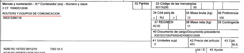 В сопроводительных документах вообще какой-то дурдом. Во-первых, общий вес посылки - 22 кило (это во второй бумаге со счетом указано)! Ничего себе! Во-вторых, в описании написано, что это роутер и средства коммуникации. Стоимостью €453.