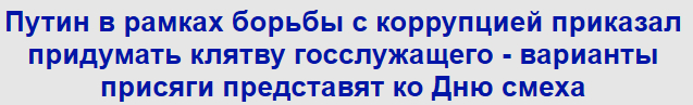 Клятва по борьбе с коррупцией- мера недостаточная - предлагаю ее совместить с молитвой за импортозамещение в присутствии работника РПЦ.Так усилием людей государевых и экономику поднимем а заодно и одолеем бездуховный. 😉