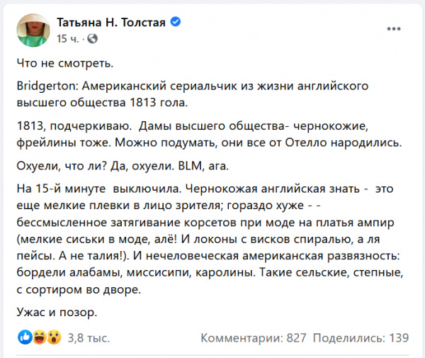 А теперь писательница Толстая заклеймила американский сериал Bridgerton.