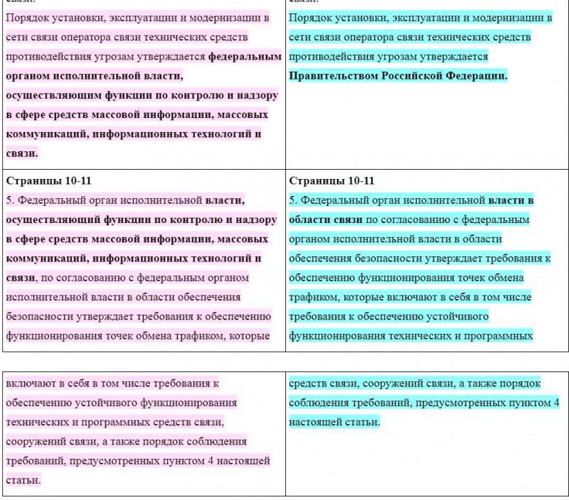 Хотите ли знать, зачем текст проекта об автономном интернете за день до второго чтения подменяли в думской базе на другой, с тем же количеством строк, но с разным количеством знаков? Вот ради этих двух поправок: розовое - было, голубое - стало. Если вам кажется, что это то же самое другими словами, то нет: это кто-то забеспокоился, что Роскомнадзор совсем уж распухает поперек себя шире на новых полномочиях, и решил аккуратно его от ресурсного центра отодвинуть. В обоих случаях в левой колонке РКН обозначен напрямую, а в правой (новый вариант) заменен на Правительство и Минсвязи, соответственно. Они еще и таблицы поправок, рекомендованных к принятию, поменяли (отклоненные не трогали, незачем). Увы, те я не успела скачать накануне, так что сравнить не с чем, но уверена, там эти же две правки будут вставлены: интересно, под чьим авторством. В общем, как это по-английски называется, warming-pan baby: подменный младенец, в спальню в сковородке принесли и за новорожденного принца выдали. Спасибо Helen Nikolaeva за изготовление красочной сравнительной таблицы.