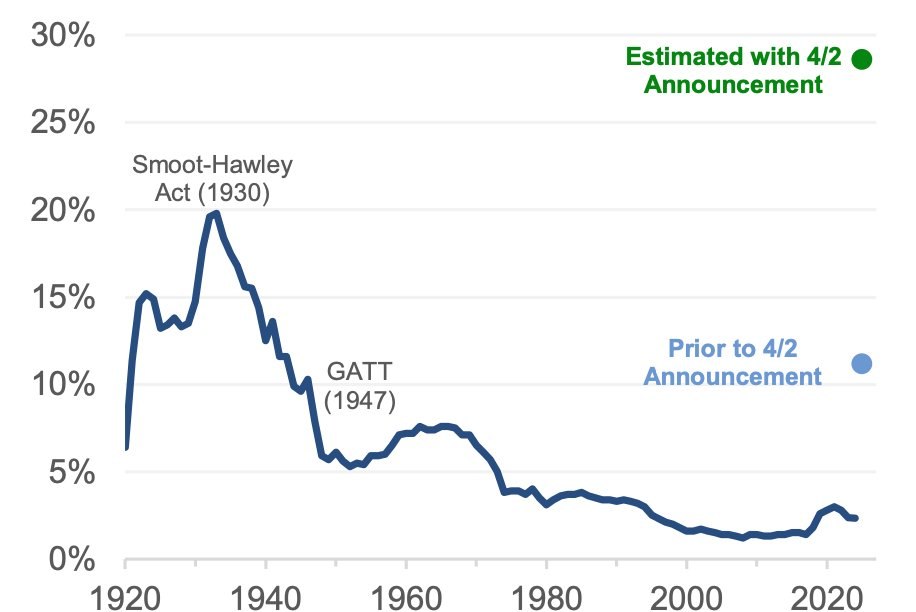 Закон Смута-Холи поднял средневзвешенную тарифную ставку до 20%. Трамп по свежим расчётам сегодня поднял тарифы в 1,5 раза больше — их средневзвешенная ставка составит 29%.