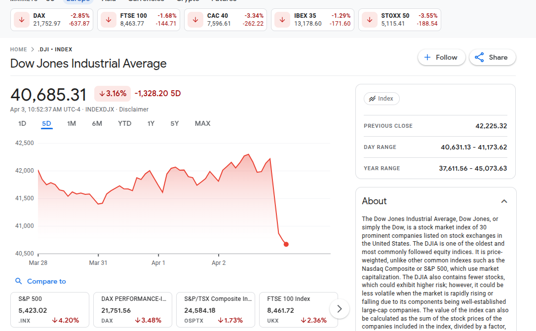 Моё понимание: все знали, что новые пошлины ухудшат экономику, поэтому акции шли вниз до вчерашнего дня по мере того, как формировалось понимание того, что произойдет. Но вчера оказалось, что всё ещё хуже, и поэтому акции на всё, что связано с внешним миром, упали примерно на 5%~6% и больше.