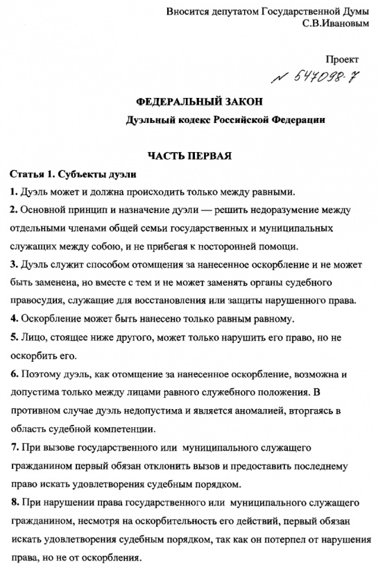 Клоун потом заявил, что внес этот проект с целью обратить внимание на то, что, типа, делом заниматься нужно, а не херней. Это по мотивам вызова на дуэль Навального было Росгвардейским начальником.