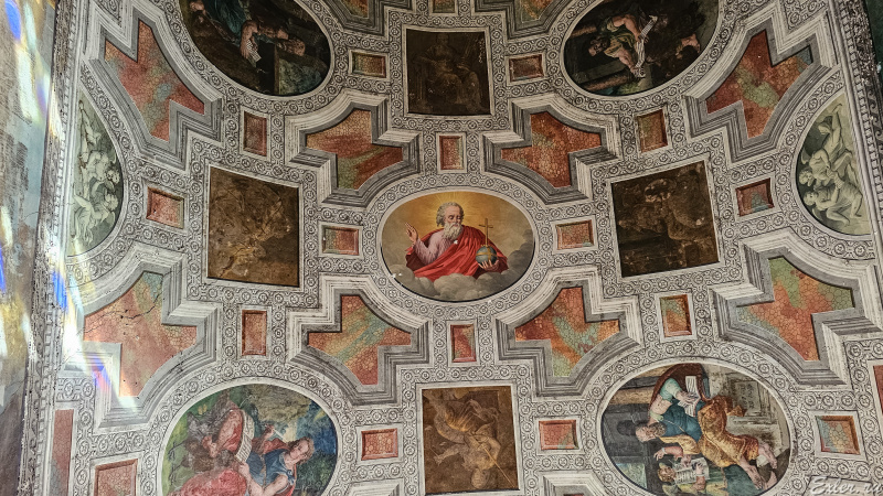 Потолок часовни сделан очень интересно - в итальянском стиле. Кажется, что это объемная лепнина, однако это рисунок.