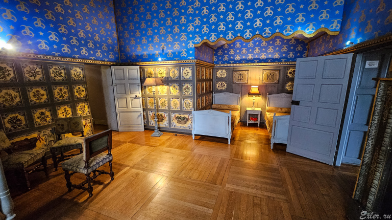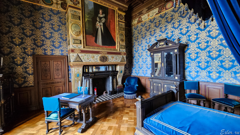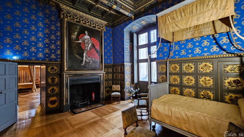Спальня одной из владелиц замка. Она рано потеряла мужа и пять лет носила траур по нему: темно-синее платье на ее портрете - знак этого траура.