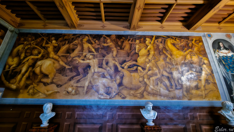 Галерея Ферсале, где принимали посетителей. Фрески, выполненные охрой, изображают  битву, в которой войска Цезаря сражались с войсками Помпея. Между фресками находилась фигура Цезаря, однако она была утрачена, после чего туда зачем-то водрузили фигуру Людовика XIII - а чтоб было!