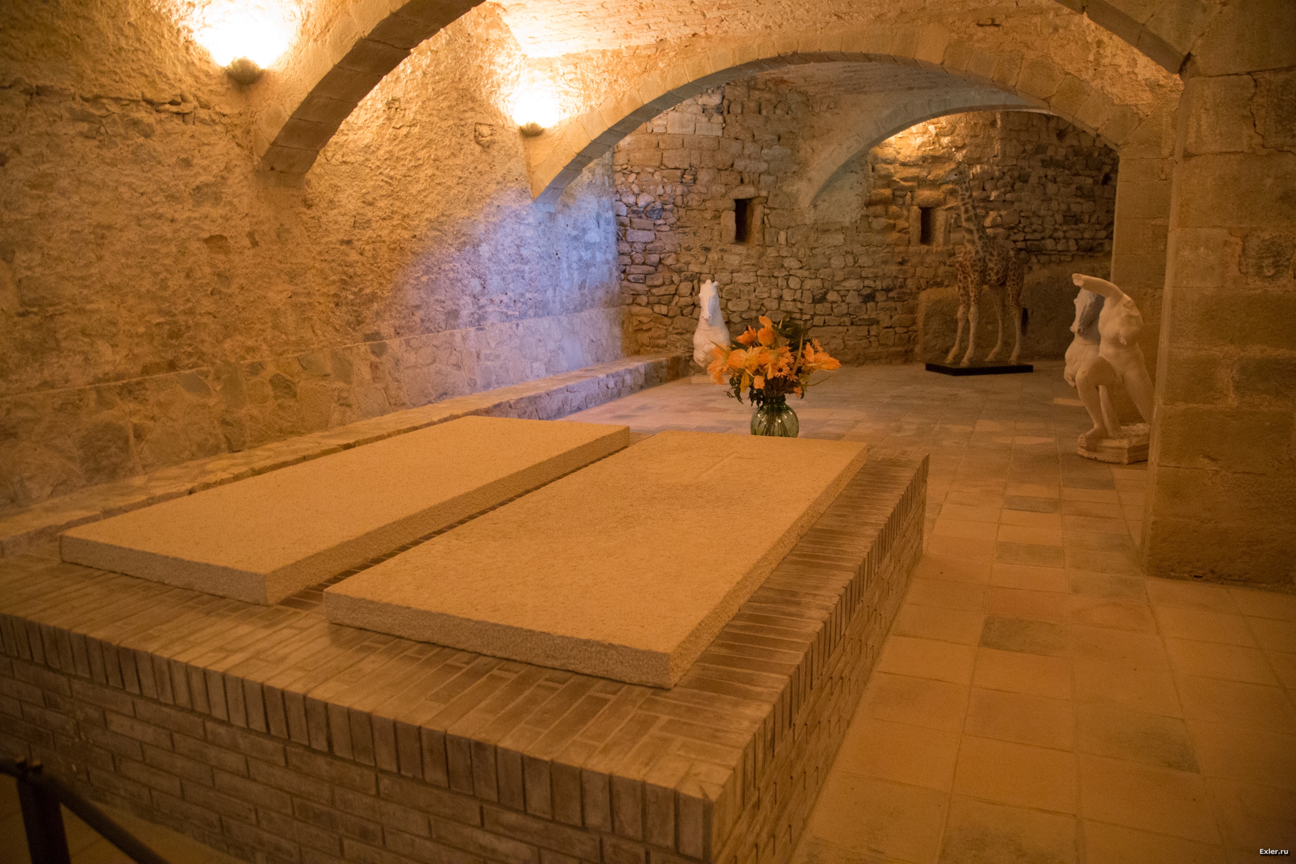 Крипта в пристройке, где похоронена Гала. Обратите внимание на жирафа на заднем плане. Вторая могила предназначалась Дали, но, как известно, он похоронен не здесь.