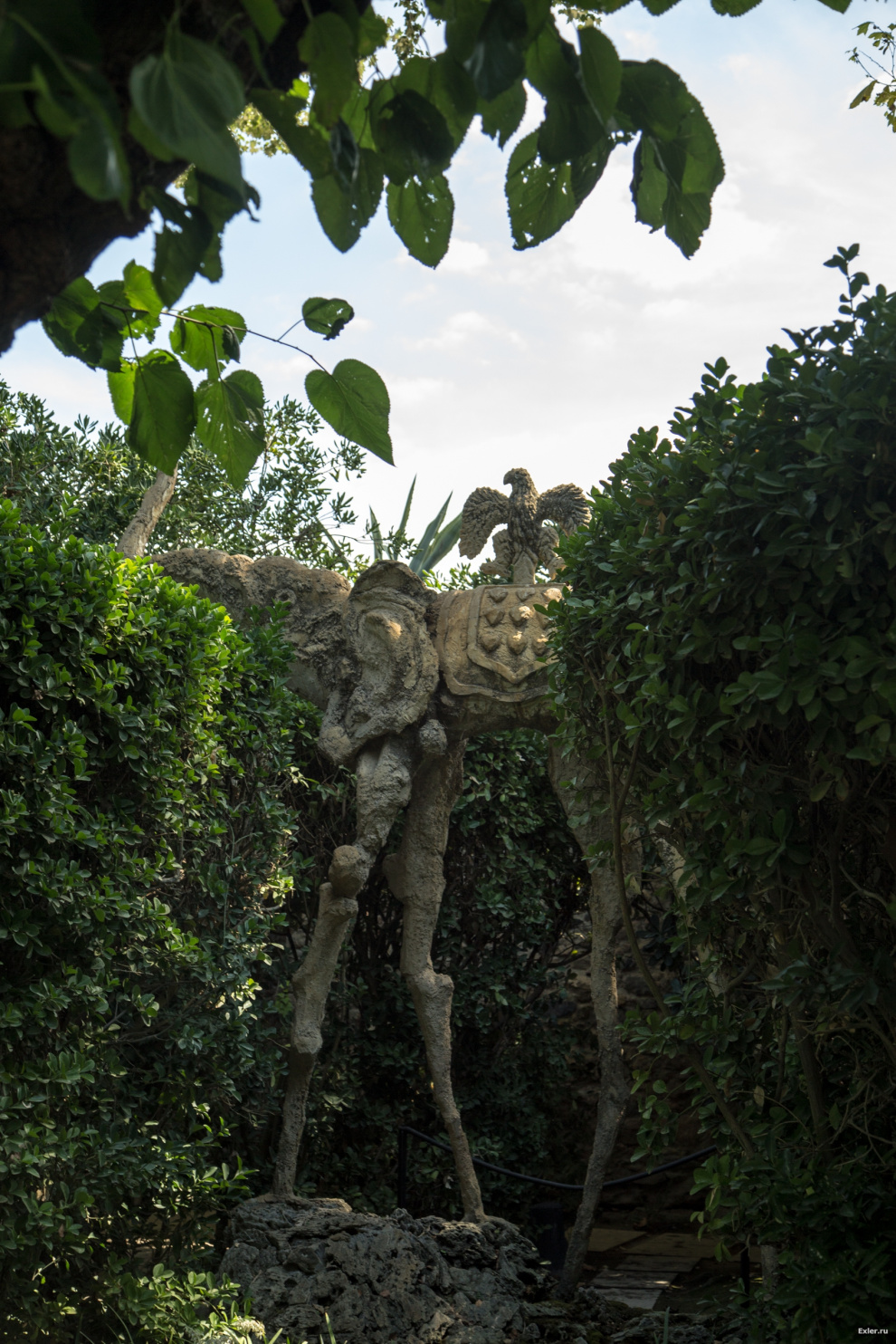 В саду гуляют тонконогие слоны с восседающими на них воронами.