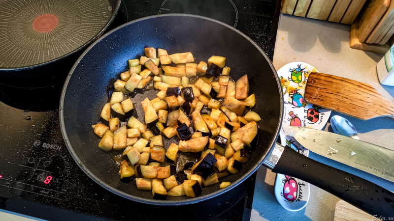 На том же масле обжарил лук, в нем обжарил баклажан.