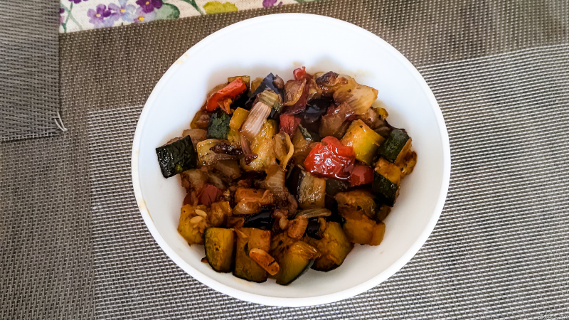 Провел эксперимент. Взял те же продукты, точно так же порезал. В волшебном горшочке обжарил лук с чесноком, покидал все овощи туда скопом, добавил сухой чеснок, красный сладкий перец, прованские травы, хмели-сунели, перемешал, выставил на 5 минут на тушение под давлением пара. (Опытным путём давно выяснил, что 5 минут под давлением для овощей - достаточно: так они становятся мягкие, но сохраняют форму и структуру, не расплываясь в кашу.)
