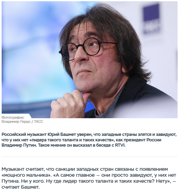 Ну, в одном Башмет прав, такого лидера нет нигде на Западе. Просто потому, что он им там нахер не нужен. 😄 Просто там люди путем эволюции научились договариваться между собой, писать адекватные законы и их соблюдать, а так же решать взаимные проблемы как конкретного двора, так и города и даже области без привлечения президентов. Даже абстрагируясь от личности конкретного вождя, надо понимать, что он всегда будет плоть от плоти "народа". Любой политик, в любой стране, как бы щеки не надувал, все равно говорит в первую очередь то, что большинство хочет слышать. Наш "властитель душ" не исключение. Бабкам нравится... 😄