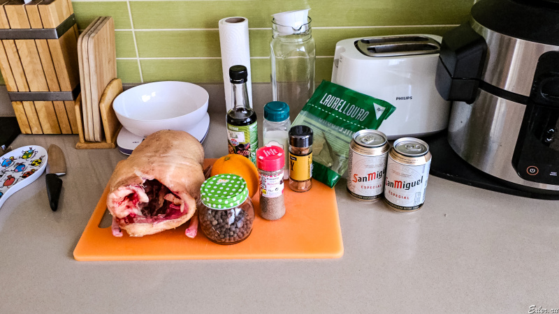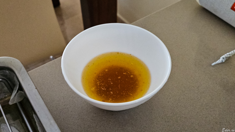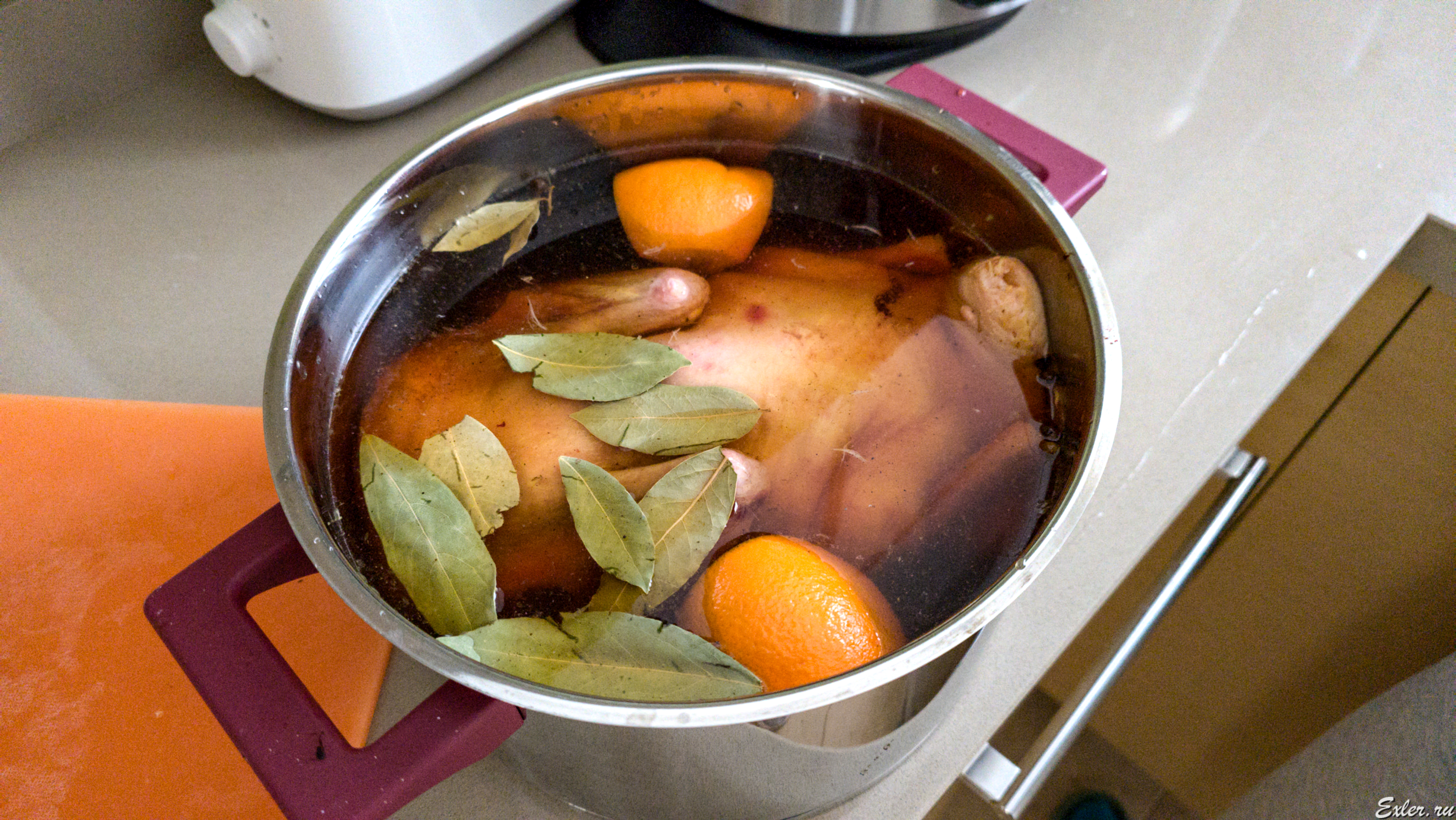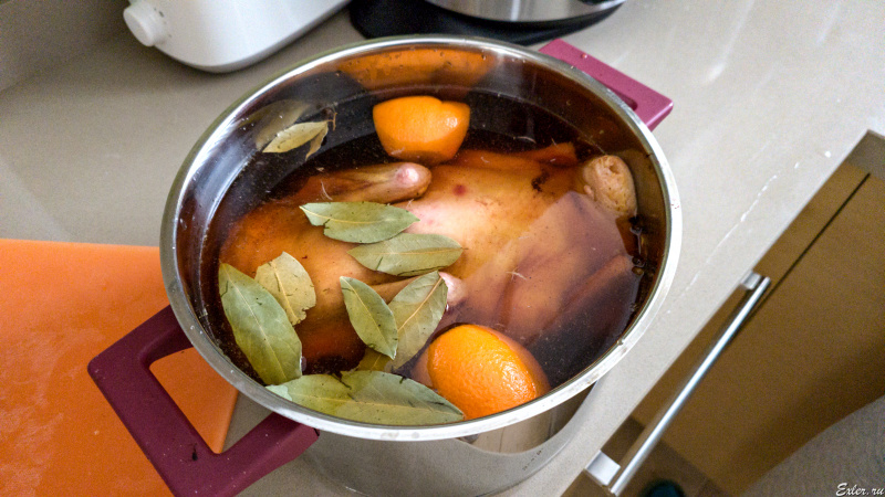Все это смешивается с водой, апельсин режется на 4 части, выжимается в маринад, апельсиновые корки кидаются туда же.