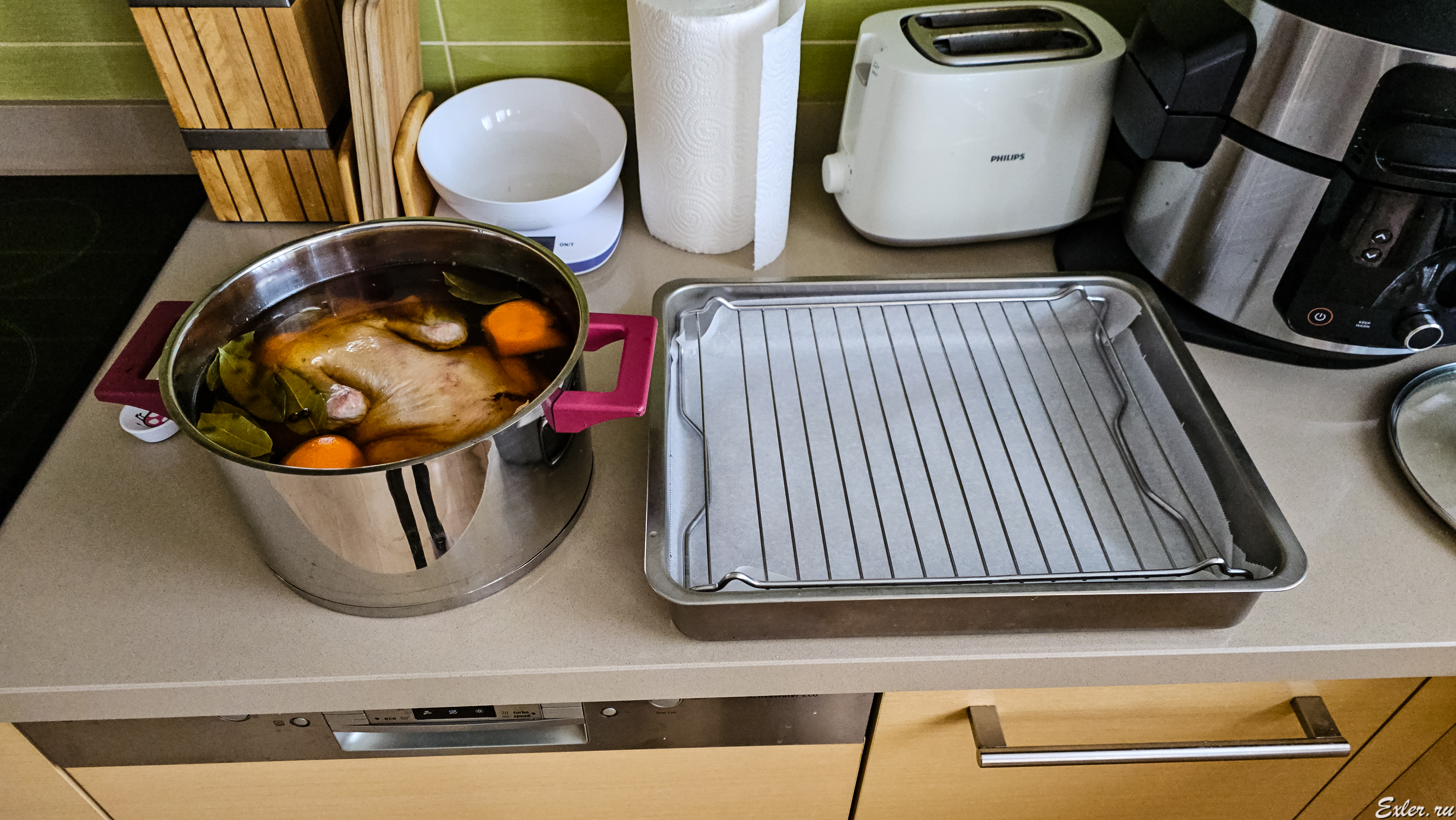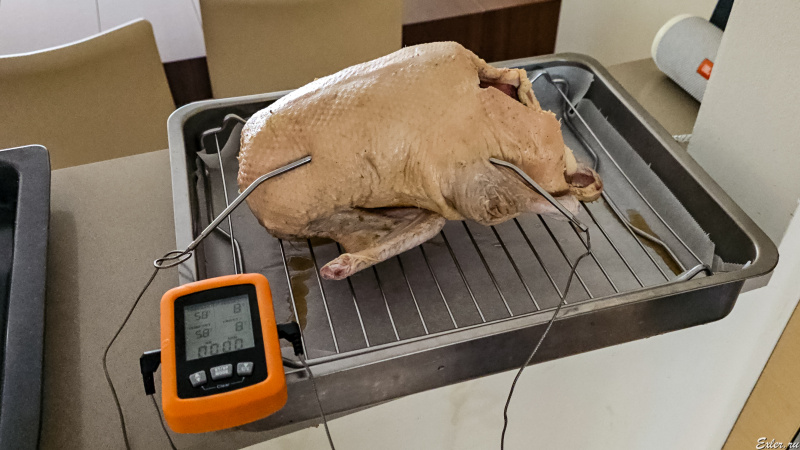 Идея у меня была следующая. Я хотел получить именно сочную и мягкую грудку. Я знал, что когда готовишь тушку, то грудку приходится готовить до well done, чтобы при этом были готовы ножки. Но я был готов пожертвовать готовностью ножек (крылья у утки все равно нет смысла есть, их проще выбросить), потому что их, если что, всегда можно довести в аэрогриле. Я же хотел получить отличную грудку.