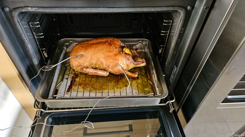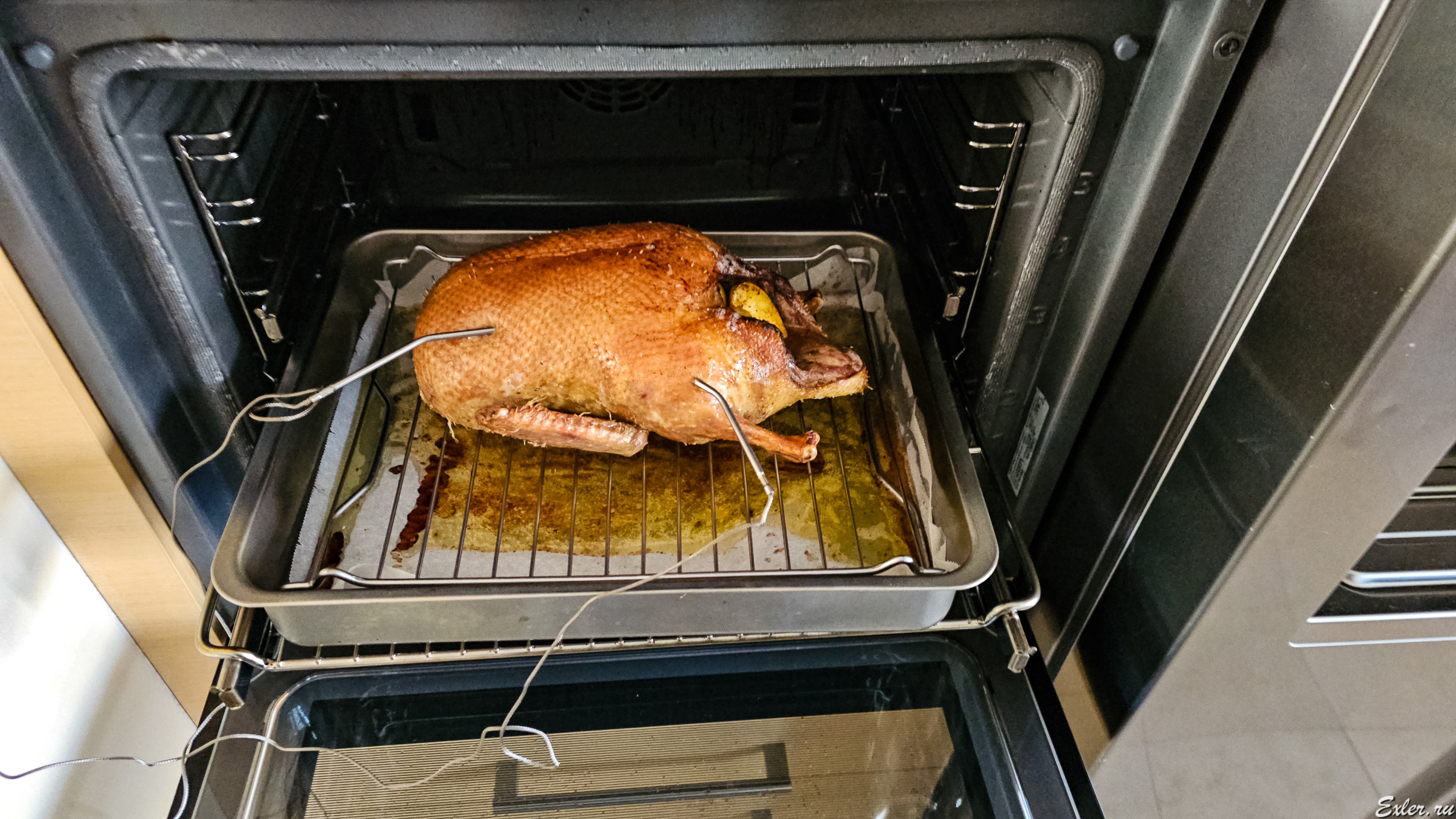 Сначала я поставил утку на 1,5 часа (а она весит 2 кг) в духовку при температуре 150 градусов. (Тот же Емельяненко рекомендует сначала запекать при невысокой температуре.) Но при этом у меня грудка дошла до 58 градусов уже через час, и я нагрев выключил и стал готовить начинку.