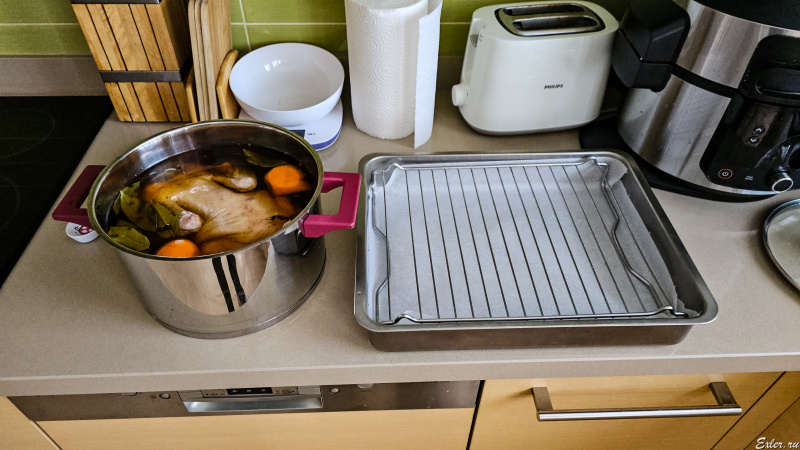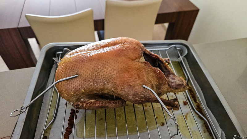 Спасибо всем за комментарии по поводу рецептов запекания цельной утки. Я почитал/посмотрел несколько рецептов, учел предыдущий опыт запекания утки у нас дома, а так как я примерно представлял, что в данном случае хочу получить, то сделал некую компиляцию из разных рецептов, но при этом за основу взял рецепт Василия Емельяненко.