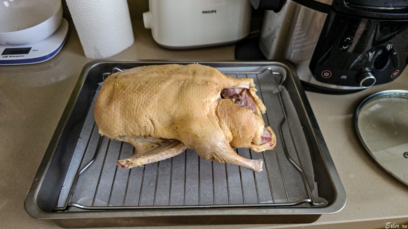 Тушку высушиваем бумажными полотенцами, больше ничего не делаем. (Многие перед готовкой вытаскивают пинцетом остатки перьев, но я пришел к выводу, что это на порядок быстрее делается уже с готовой уткой - там они вытаскивются легко и быстро, а с сырой тушкой можно и час провозиться.)
