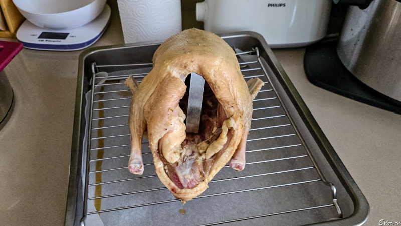 Перед первичным приготовлением я утку не фарширую. В каких-то рецептах рекомендуют внутрь засунуть целый апельсин, чтобы он распер утку изнутри, но апельсин будет препятствовать запеканию изнутри, поэтому я просто вставил железную распорку (можно чайную ложку, но я туда поставил железный пинцет для рыбы).